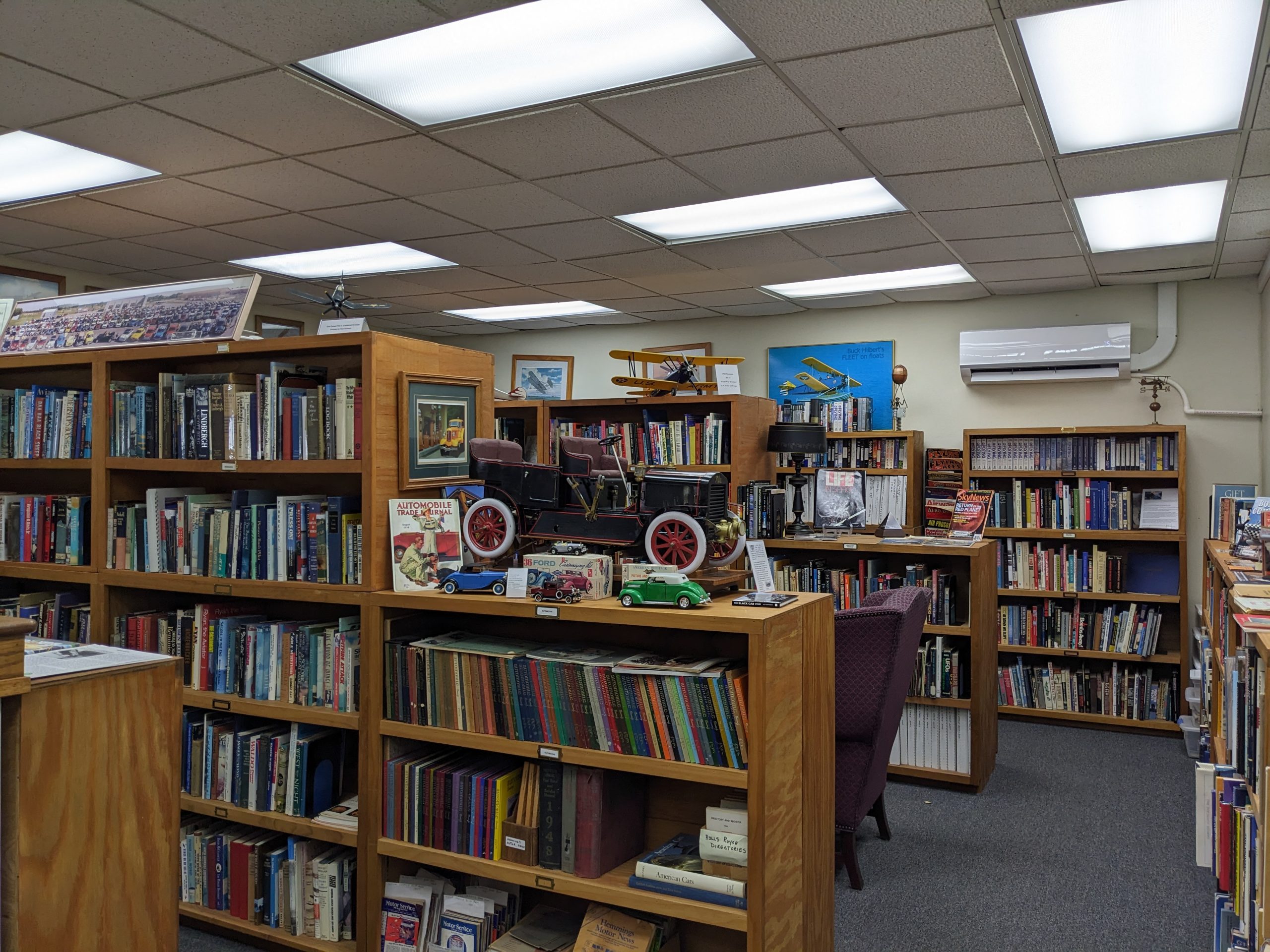 Please take a few minutes to visit our research library located on the second level. Thanks to past book donations, we have an extensive collection of general aviation, military aviation, and automotive related materials. All visitors are welcome to see the collection. Were the Wright brothers really the first to fly? Henry Ford’s production cars ran on gasoline, which car, in 1909 ran on steam? A Flying Flea??? The answers can be found in the library’s mini-displays.
