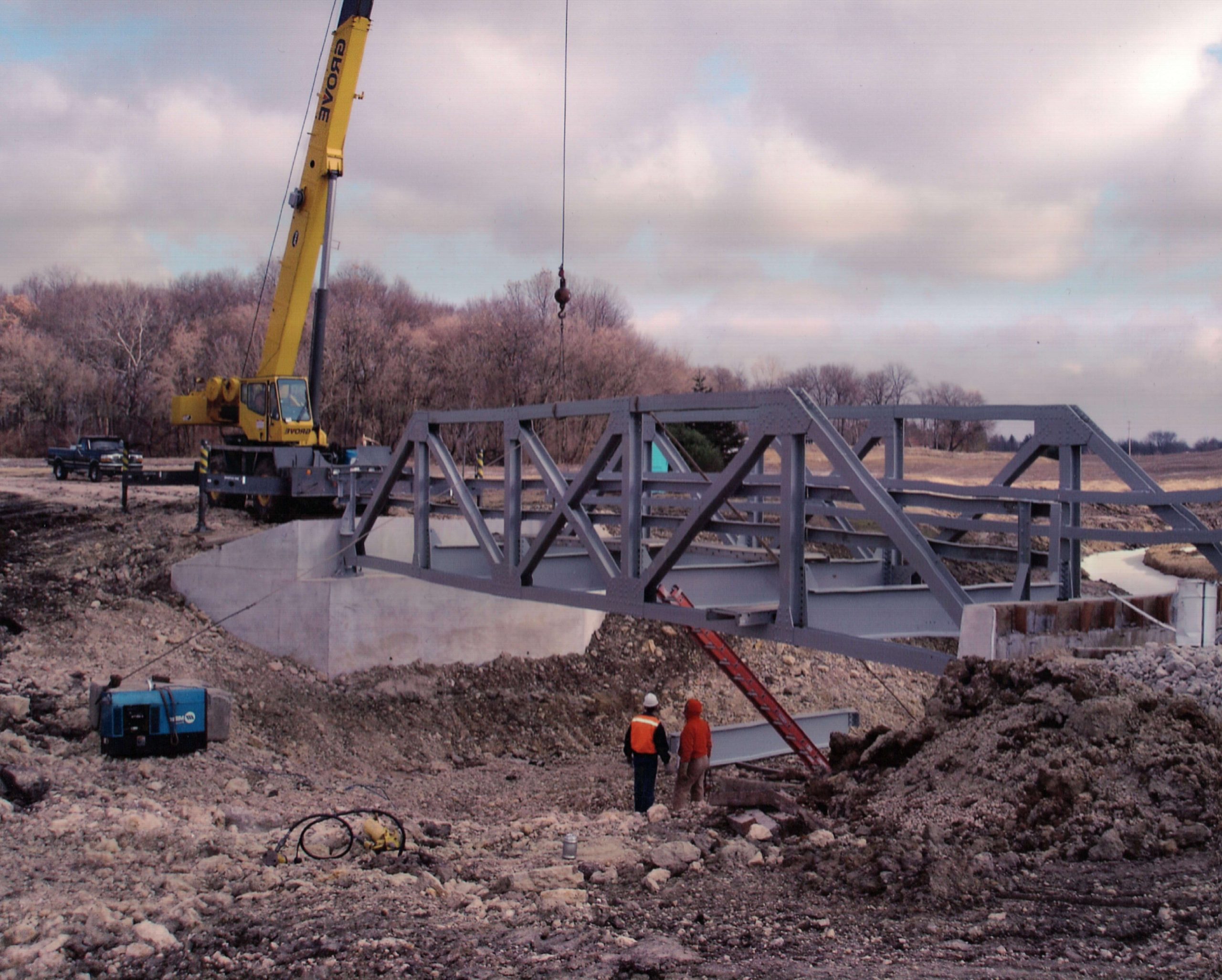Normally old road bridges are not considered worth saving. Fortunately, Steve Thomas thought otherwise. This bridge, constructed in 1937, originally spanned a small creek on Graf Road, east of Maxon Road near the small hamlet of Lawrence, northwest of Harvard, IL. Named after Frank Beck, a local road commissioner, the bridge has a “pony” truss design and was one of the last of these types of bridges in McHenry County. However, the old bridge only has a 12-ton weight limit, whereas other road bridges generally have a capacity of 36 tons. The county road commission decided to replace it in 1998 and the old bridge was scheduled for demolition and scrapping. This is when concerned local resident Jeannie Hill stepped in and contacted Steve Thomas, the owner of the Poplar Grove Airport. Steve, along with Butch Rafferty, snapped into action and secured the acquisition of the Graf Road Bridge.